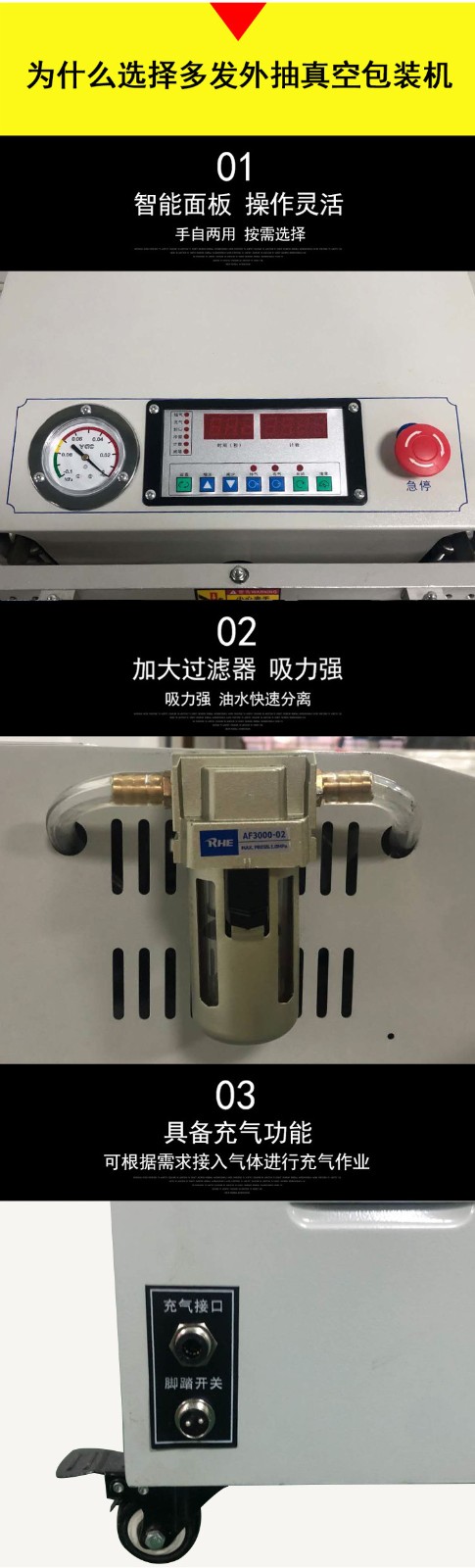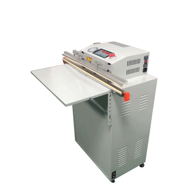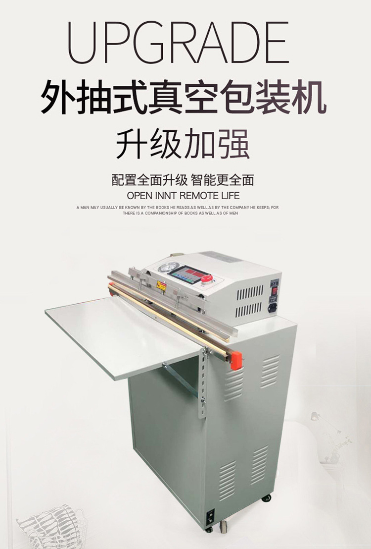 外抽真空包裝機的工作原理是將包裝袋置于真空室外的工作臺上,通過抽氣嘴伸入包裝袋內,然后啟動真空泵,抽出包裝袋內的空氣,達到設定的真空度后,進行封口操作,完成包裝過程。