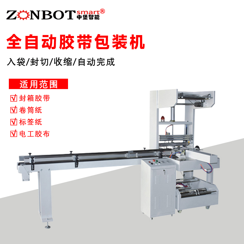 • 定義:全自動膠帶包裝機是一種專門用于膠帶產(chǎn)品包裝的自動化設(shè)備。它能夠自動完成膠帶的進料、裹包、封口、貼標(biāo)等一系列包裝工序,大大提高了膠帶包裝的效率和質(zhì)量。