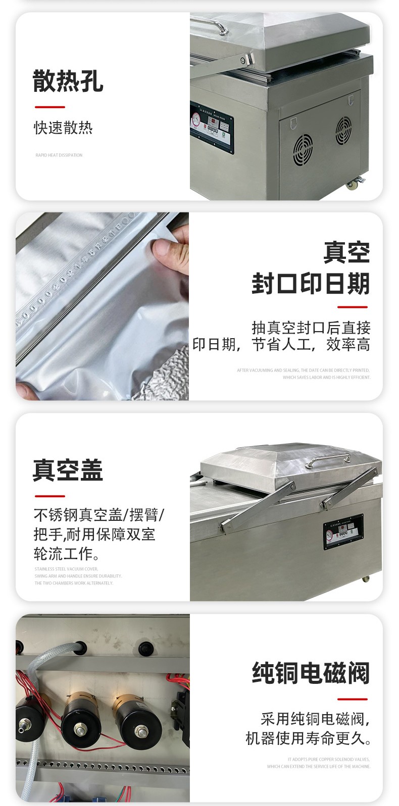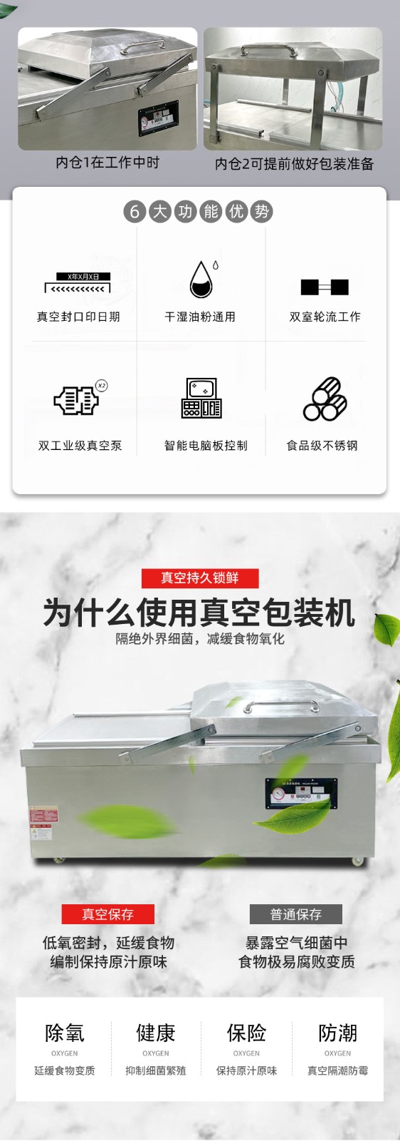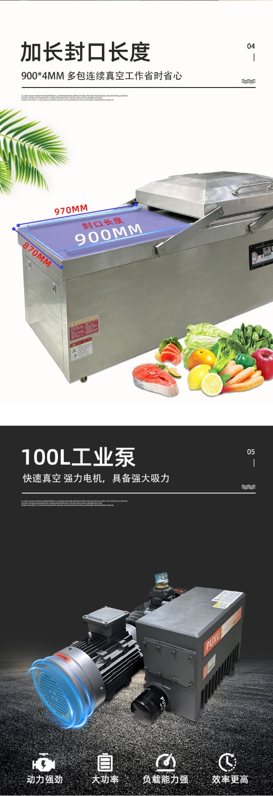 • 高效工作:采用雙室交替工作方式,當一個真空室在抽真空時,另一個真空室可以擺放包裝物,極大地提高了工作效率,適用于較大規模生產型企業7