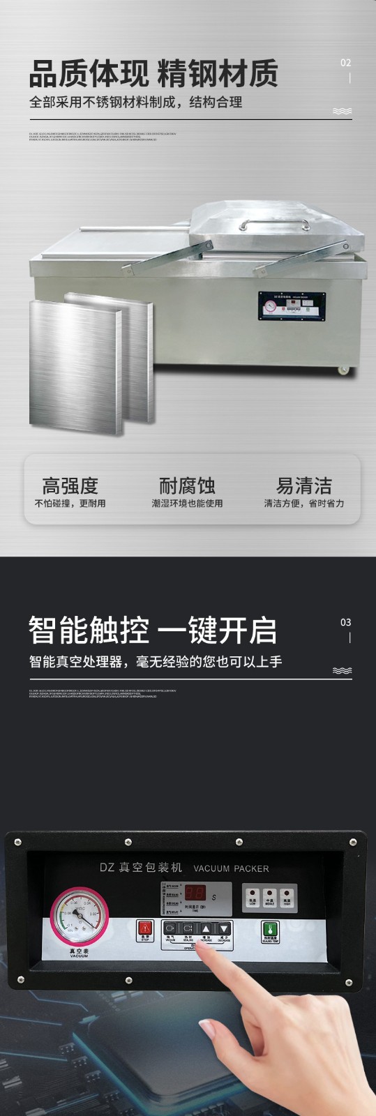 • 優質材質:通常外殼采用 304 不銹鋼制作,強度高、耐腐蝕、不易破損,且符合食品衛生要求。真空室采用高密度材料制作的 V 形密封條,保證了設備的密封性、耐壓性和耐磨性7