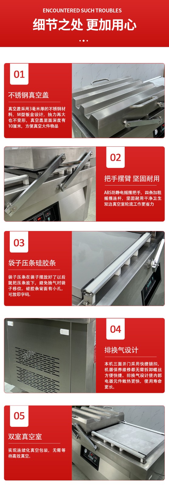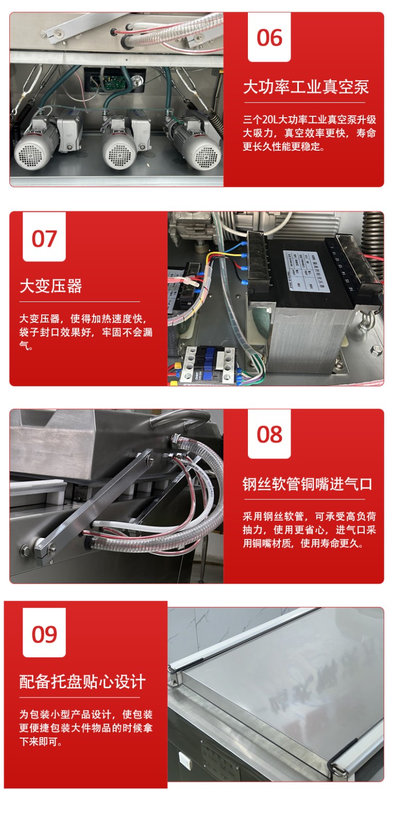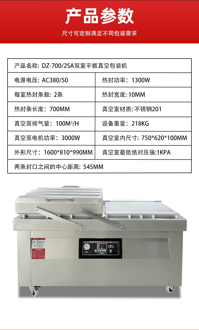 高效作業:兩個工作室交替工作,大大提高了包裝效率,較單室機型效率提升 1.5 倍以上,包裝速度可達每分鐘 1-4 次,典型工作循環時間為 15-40 秒 / 次。 多功能適配:可對各類形態物料進行包裝,包括固體、粉狀 / 顆粒、糊狀 / 液體、松散物品等,還可根據不同產品需求,選配加深型真空室、下凹式或斜坡式真空室、充氣裝置、日期噴碼功能等。 操作簡便:采用微電腦控制系統、觸摸屏或 PLC 控制器等先進電氣系統,操作簡單方便,參數設定直觀清晰,工作人員經過簡單培訓即可熟練操作。 穩定性強:設計合理,機械技