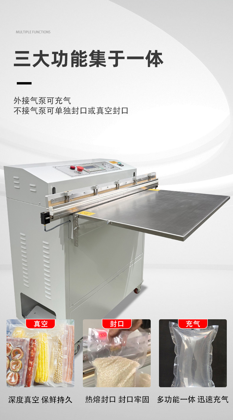 • 適配多場景:支持 PE、PA、鋁箔等多種包裝材料,可切換 “真空封口”“充氣保鮮” 兩種模式,兼顧工業防銹與食品保鮮需求。