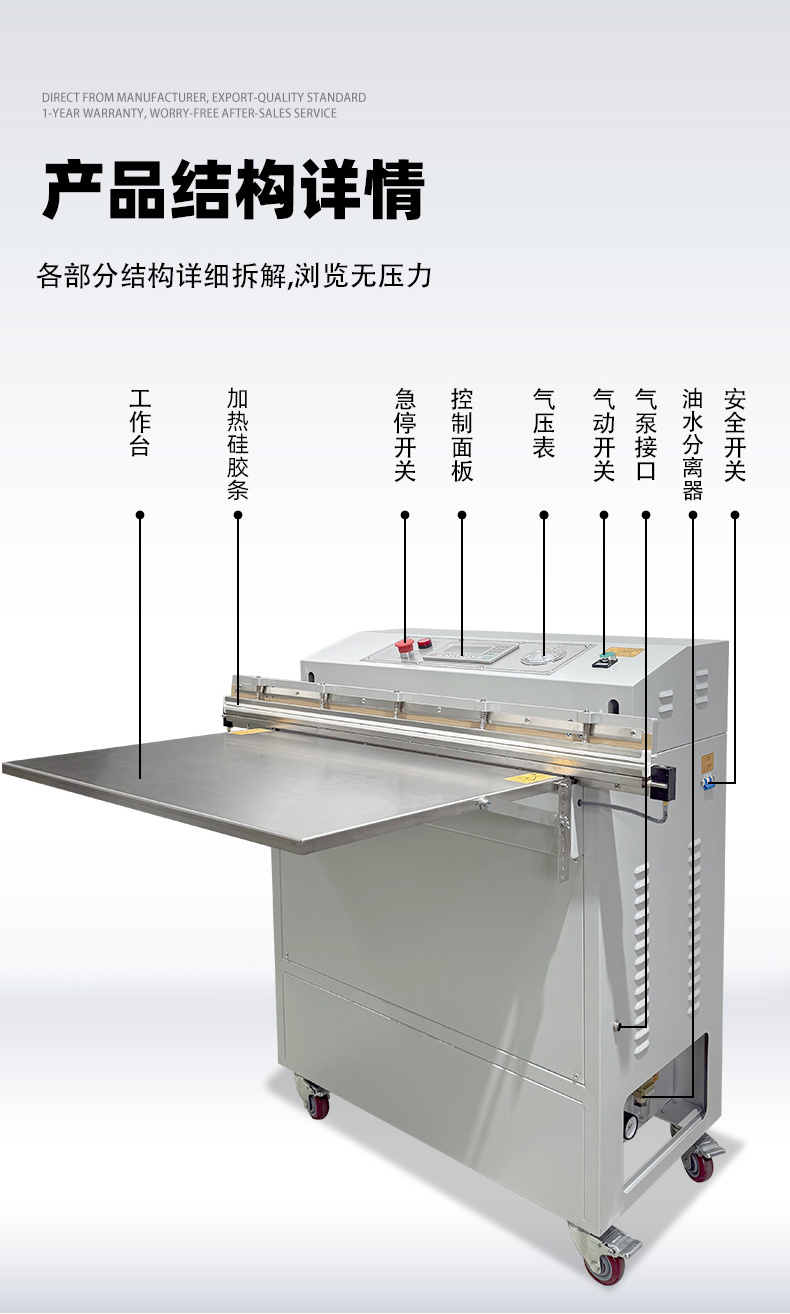 1000 型外抽真空包裝機是一款大尺寸外抽式真空設備,核心用于對體積較大、外形不規則或怕壓的物品進行真空包裝,通過外部抽氣實現防潮、防塵、保鮮或防銹保護。 1. 核心特點 包裝尺寸大:“1000 型” 通常指其有效包裝寬度約 1000mm,可容納大件物品,如整箱零件、大型布料、家具配件、工業組件等。 外抽式設計:抽真空組件在包裝腔外部,無需將物品完全放入密閉腔體內,能處理超出設備腔體尺寸的產品,也避免了內抽式設備對易碎、怕壓物品的擠壓。 適配性強:支持多種包裝材料,如 PE 復合膜、鋁箔膜等;可根據需求選