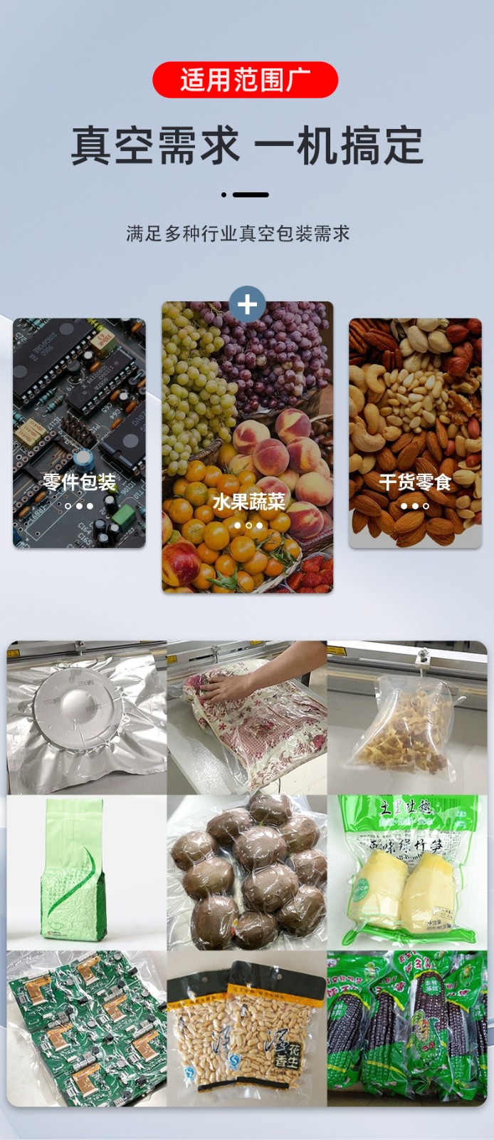 • 工業領域:大型機械零件、金屬構件、整箱電子元件的真空包裝,防止運輸中受潮、生銹。