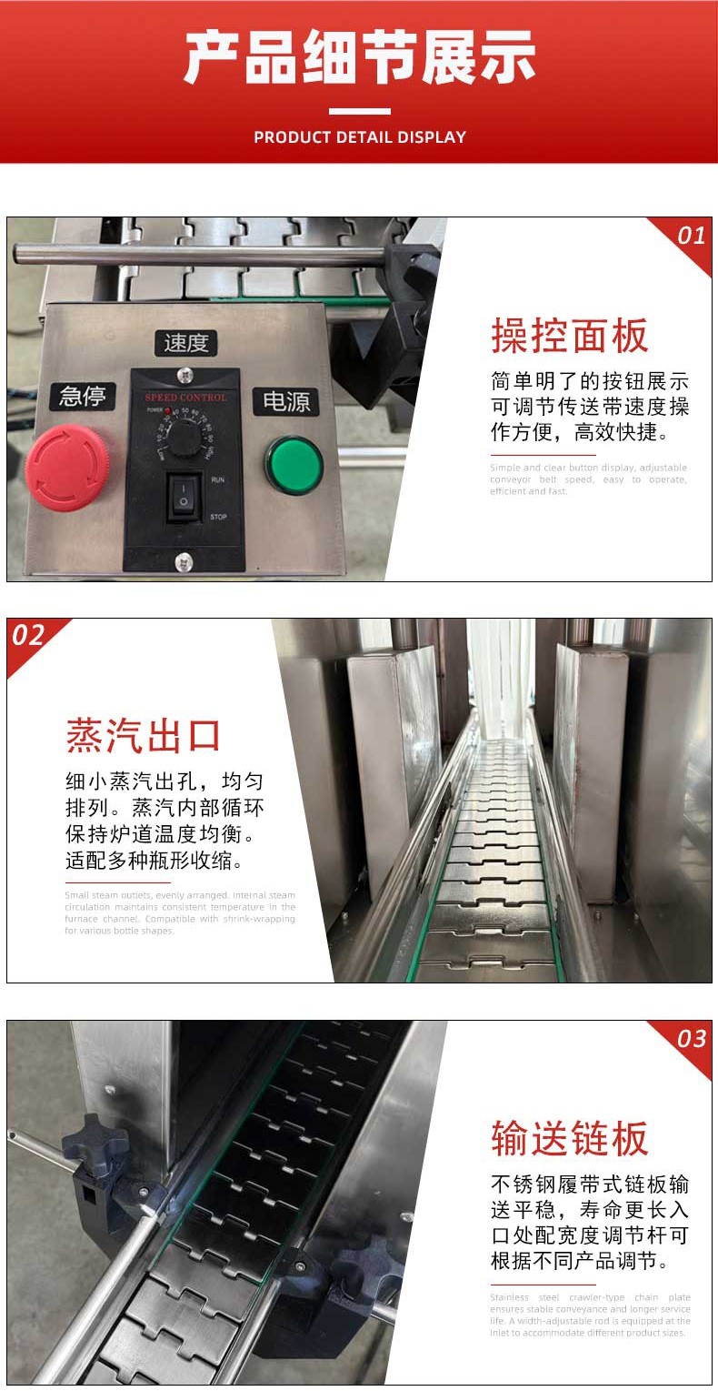 • 輸送系統(tǒng):用于平穩(wěn)傳送待包裝的產(chǎn)品,使其能在收縮室內(nèi)均勻接受蒸汽作用。