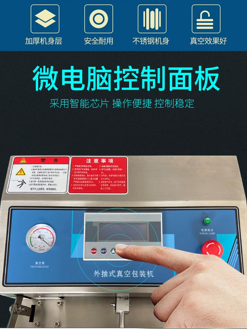 真空包裝機能夠自動抽出包裝袋內的空氣,達到預定真空度后完成封口工序。亦可再充入氮氣或其它混合氣體,然后完成封口工序。真空包裝機常被用于食品行業,因為經過真空包裝以后,食品能夠抗氧化,從而達到長期保存的目的。
