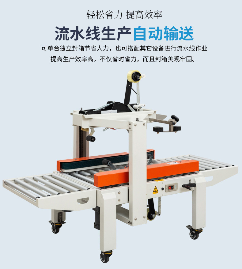 封箱機,也稱為Case sealer machine,主要用于紙箱的封箱包裝。它們不僅適用于單機作業,也可以與流水線配套使用,是包裝流水線作業中不可或缺的設備。封箱機的功能包括自動折疊、粘合和封口紙箱,通過先進的感應和控制技術,能夠自動檢測和調整紙箱尺寸,按照設計要求進行折疊和封口操作,大大提高了包裝的效率和一致性,減少了人工操作的錯誤和勞動強度。