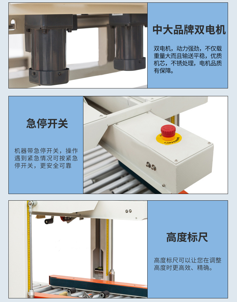 封箱機,也稱為Case sealer machine,主要用于紙箱的封箱包裝。它們不僅適用于單機作業,也可以與流水線配套使用,是包裝流水線作業中不可或缺的設備。封箱機的功能包括自動折疊、粘合和封口紙箱,通過先進的感應和控制技術,能夠自動檢測和調整紙箱尺寸,按照設計要求進行折疊和封口操作,大大提高了包裝的效率和一致性,減少了人工操作的錯誤和勞動強度。