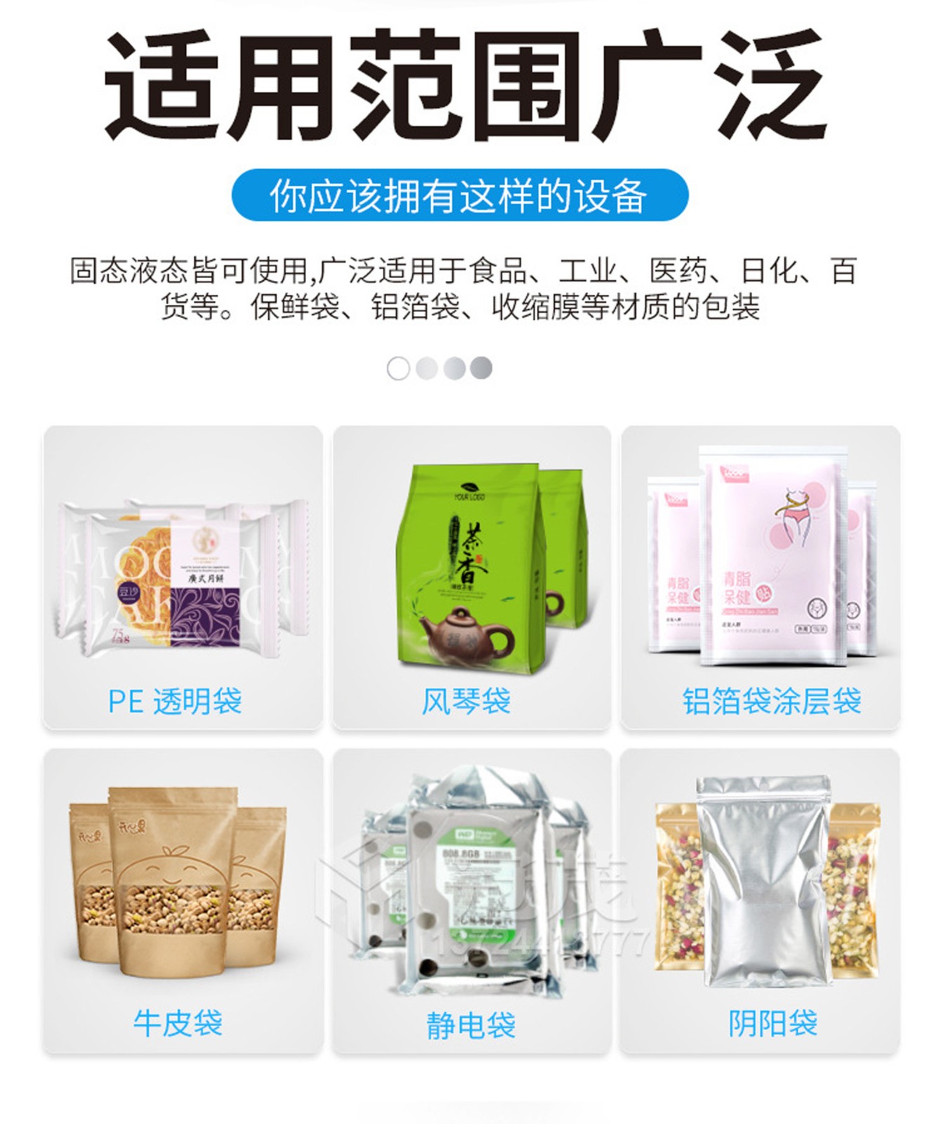 主要用于對塑料杯、塑料盒以及塑料瓶的填料,相應材料復合膜封口制品的生產。如果凍、果汁、牛奶、酸奶、飲料、快餐食品等物料的填充及封口。可適應于不同粘度的液、漿的充填物,可適應不同形狀,容量的包裝容器。