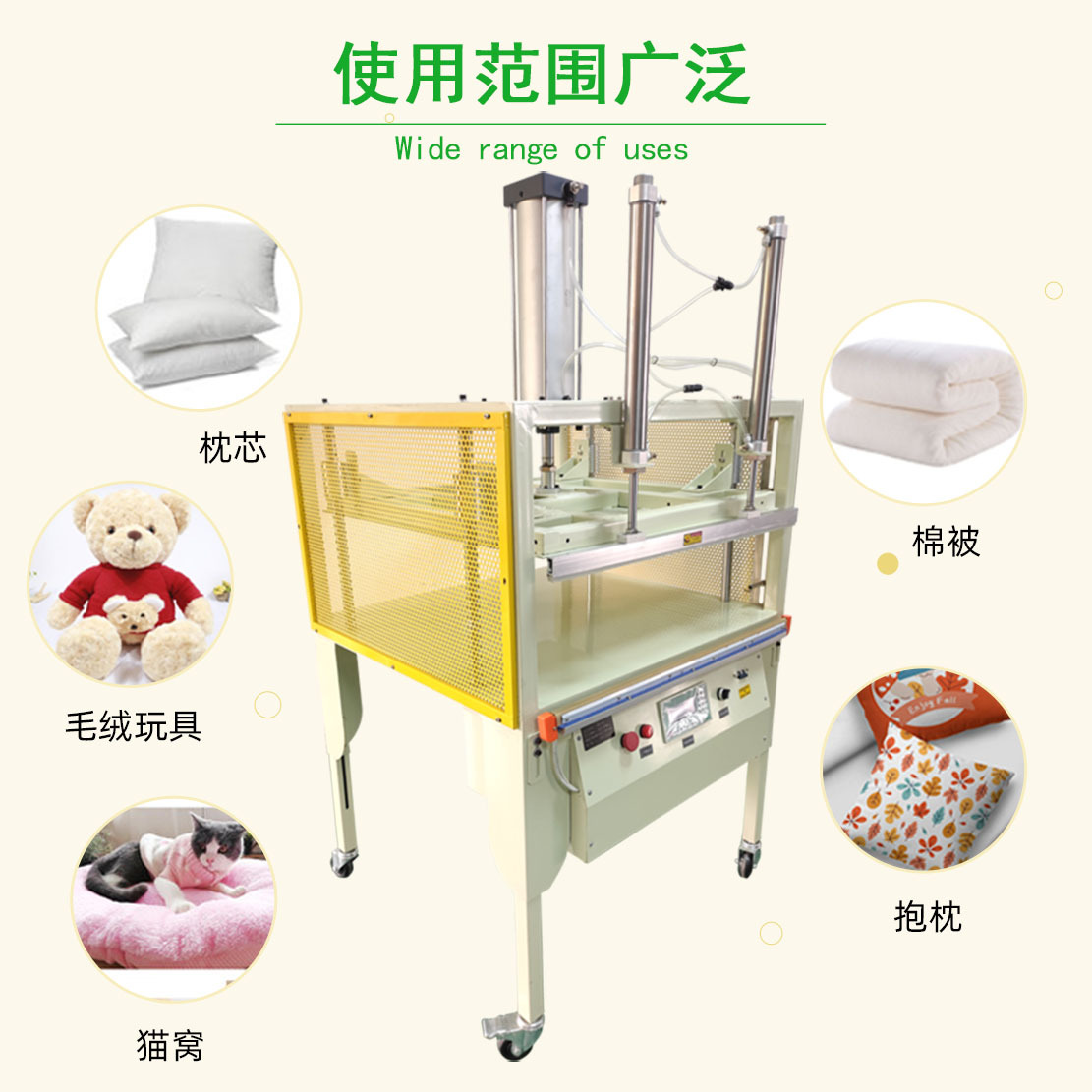 壓縮包裝封口機適用于壓縮包裝羽絨被服、太空棉被服、枕頭、發泡棉、毛巾等蓬松的其它物品。可縮小包裝的物品及防潮防塵