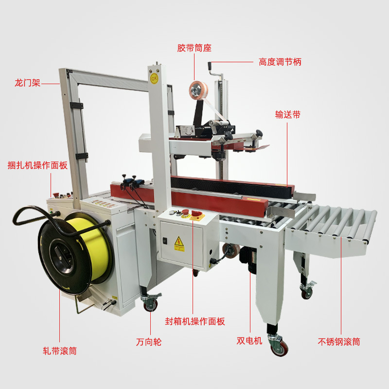 封箱打包一體機是一種機電一體化的自動裝箱設備,?它結合了自動折蓋封箱機和全自動捆包機,?形成了一個完整的包裝流水線系統。?這種機器特別適用于食品、?醫藥、?日化等行業,?能夠處理各種大小貨物的打包捆扎,?包括紙箱打包、?紙張打包、?藥箱打包等。?它的設計特點是臺面滾筒無動力,?針對顧客封箱及捆包雙機一體設計,?使得封箱、?捆包作業一體化,?提高了工作效率,?降低了人力成本。? 封箱打包一體機還支持加工定制,?可以根據客戶需求進行特殊定制,?滿足不同行業的包裝需求。?在食品、?醫藥、?日化等行業,?封箱打